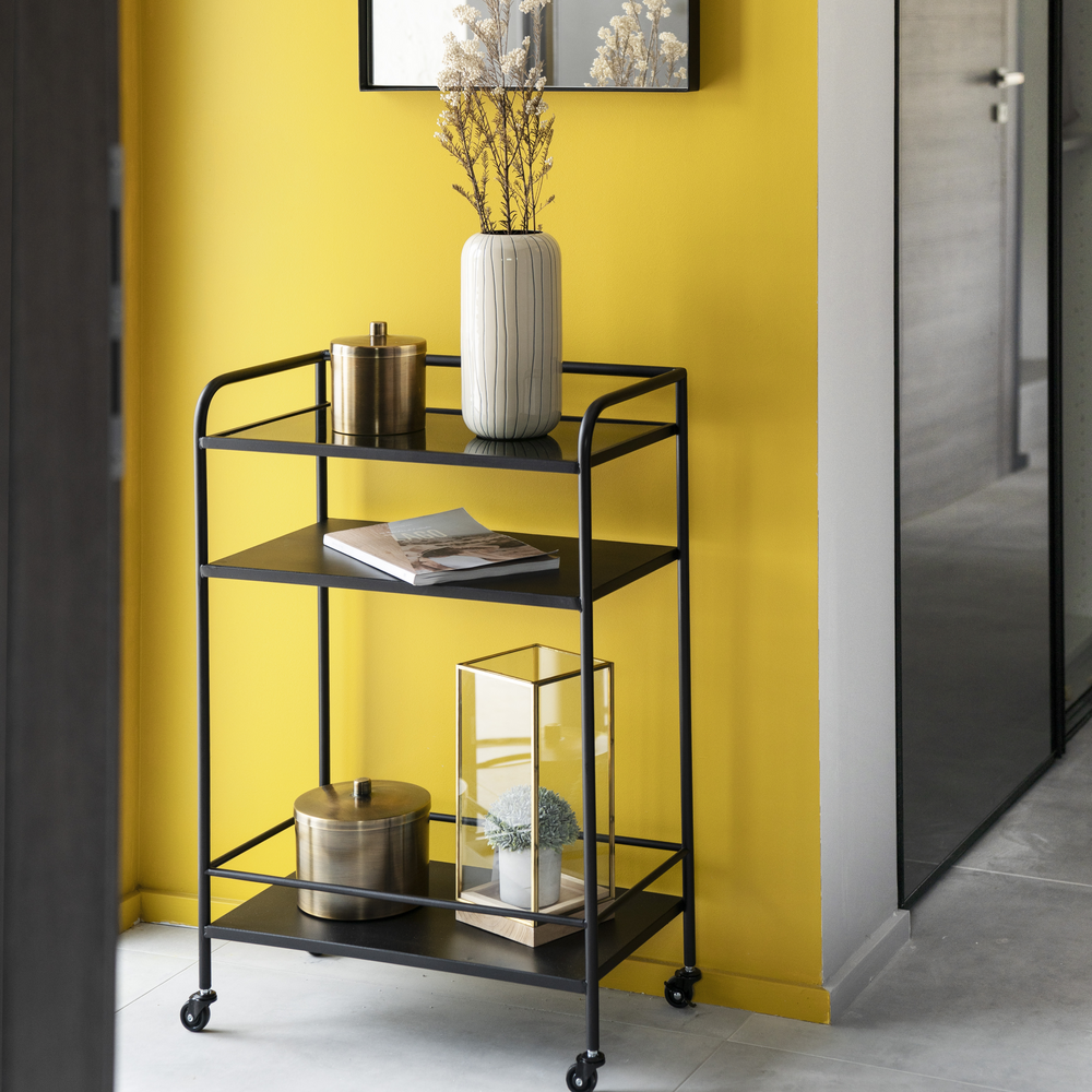 Ce meuble mobile peut servir de plan de travail, pour cuisiner ou disposer du petit électroménager comme une machine à café ainsi que de passe-plat.