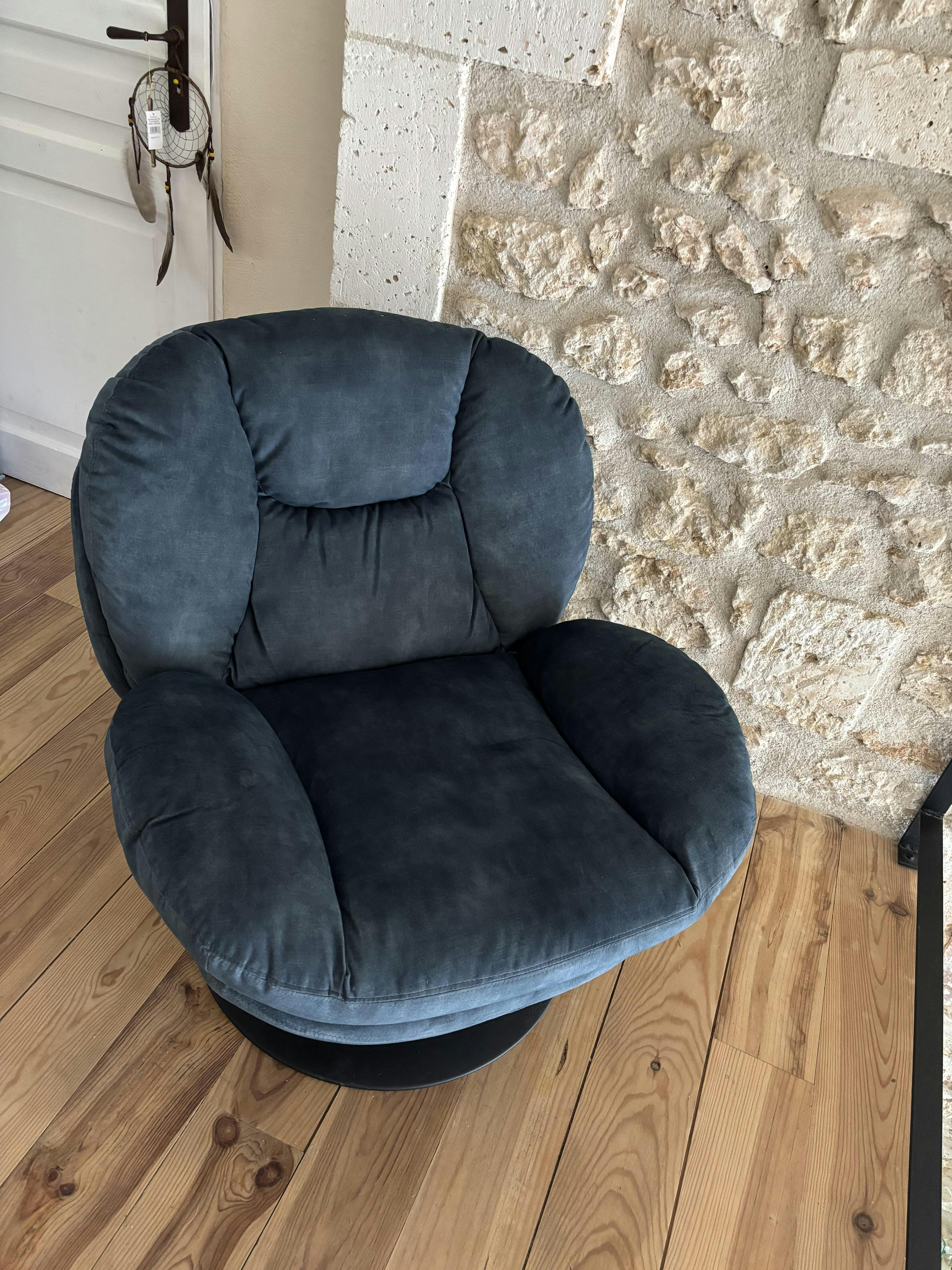 Avec son revêtement en velours et tissu texturé, ce fauteuil tout doux est aussi confortable que raffiné. Son assise est soutenue par un pied central rond pivotant en métal noir ou chrome, apportant une touche à la fois rétro et contemporaine.