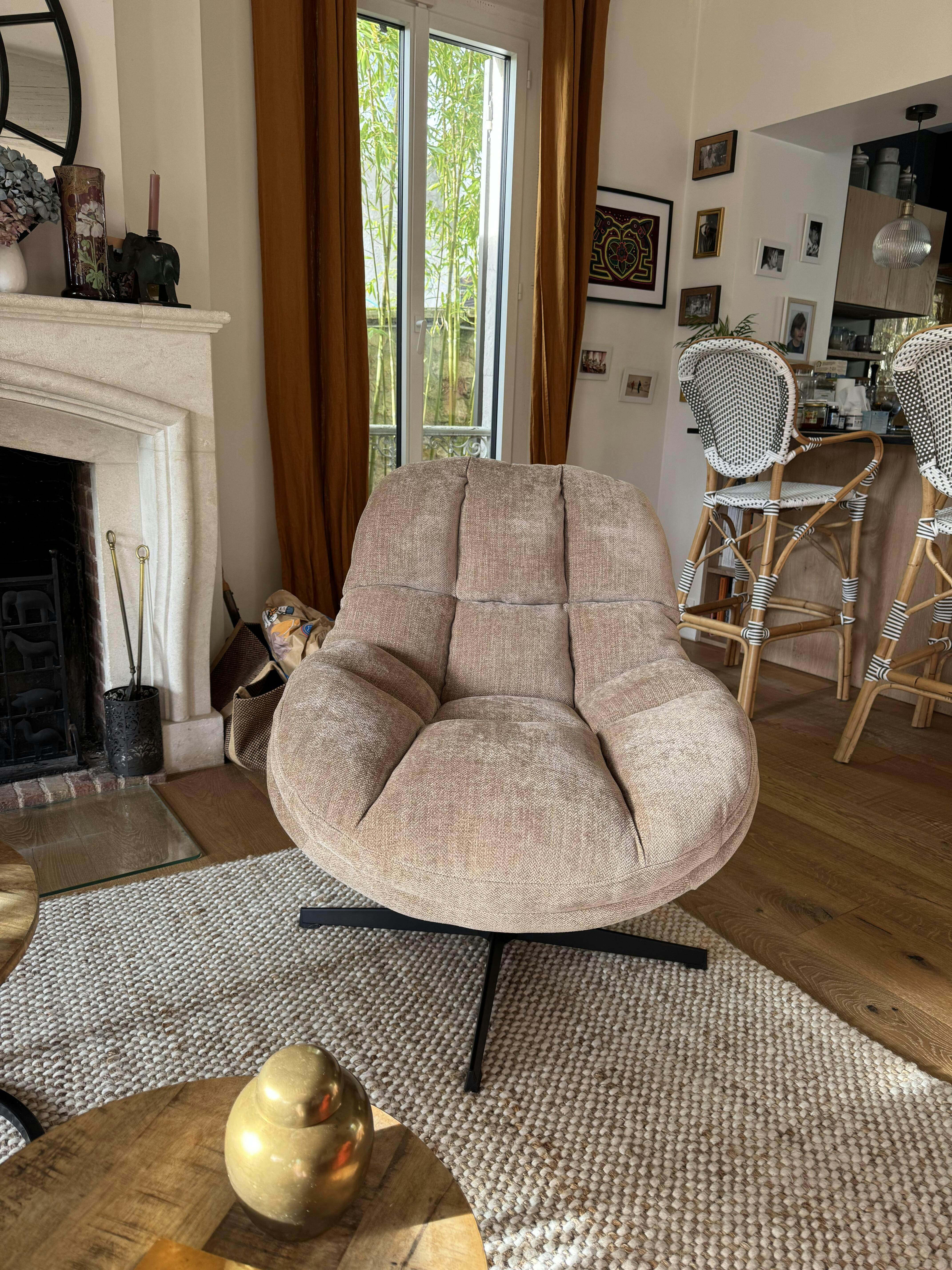 Ce fauteuil pivotant incarne à la fois le design vintage et le confort moderne. Son revêtement est un tissu doux, disponible en quatre teintes : sable, terracotta, bleu et gris. Il s'intègre harmonieusement dans les intérieurs à la déco contemporaine ou vintage.